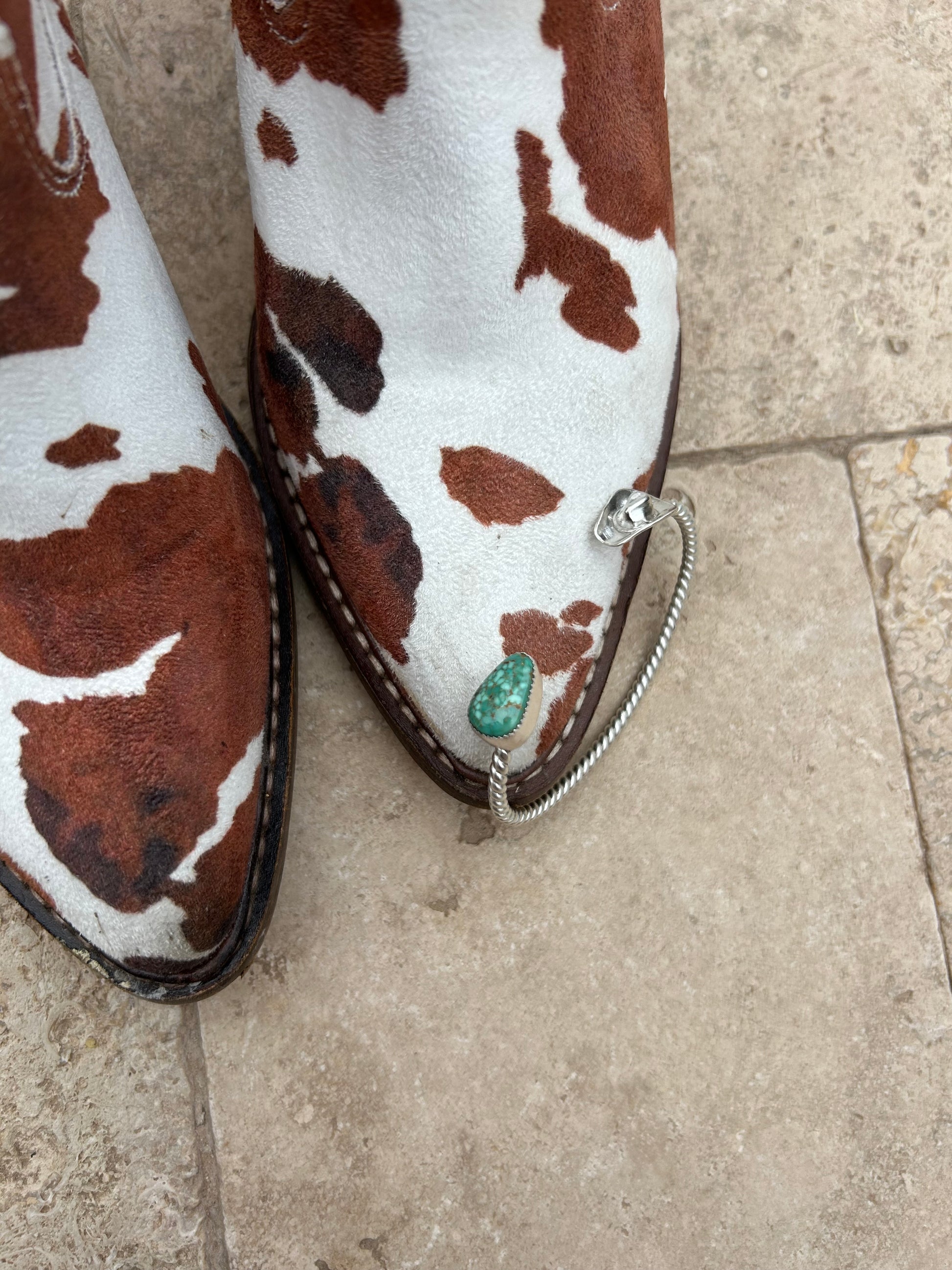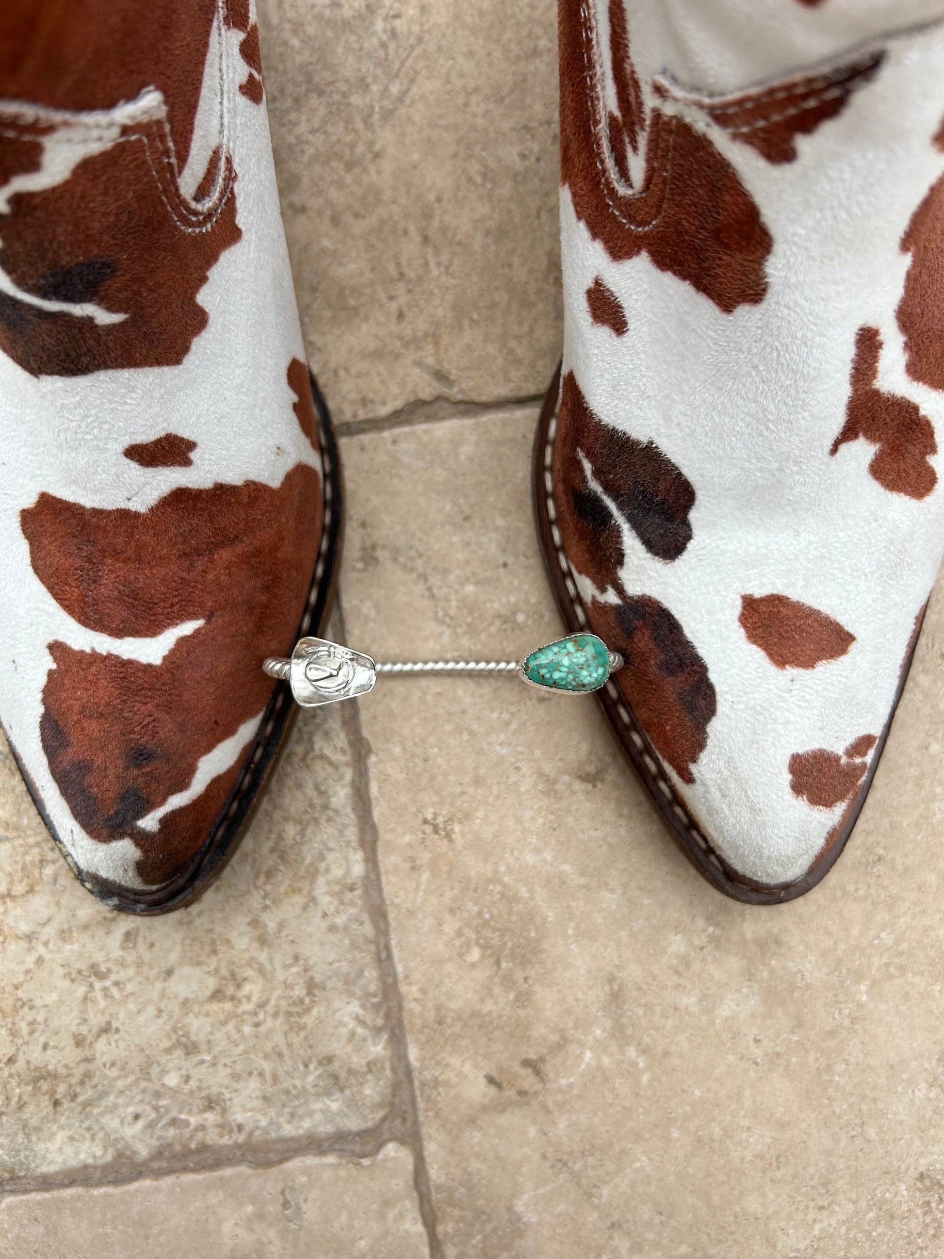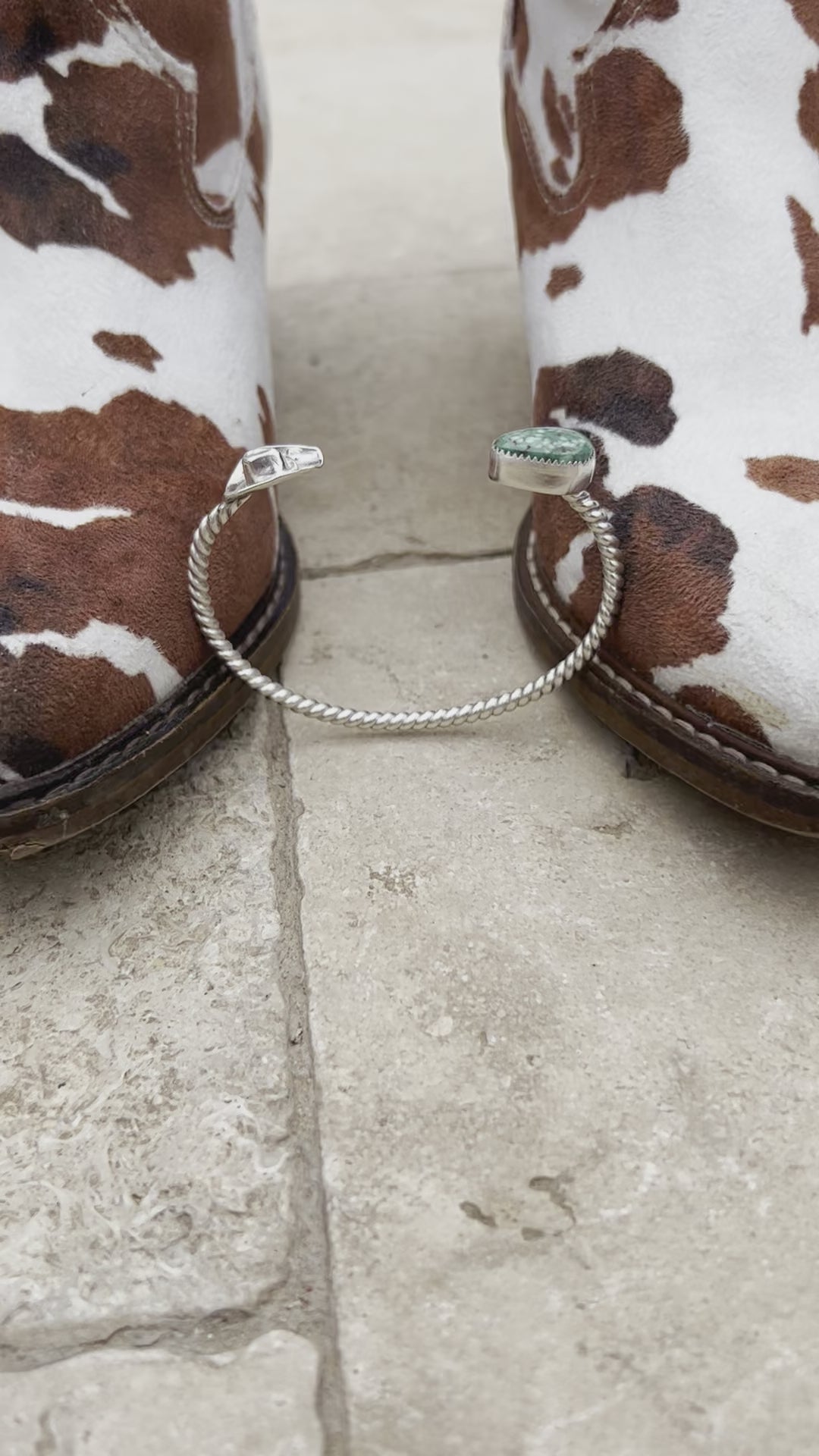 Sterling silver twisted wire cuff with cowboy hat casting and a Sonoran Gold Turquoise pear shape stone.
