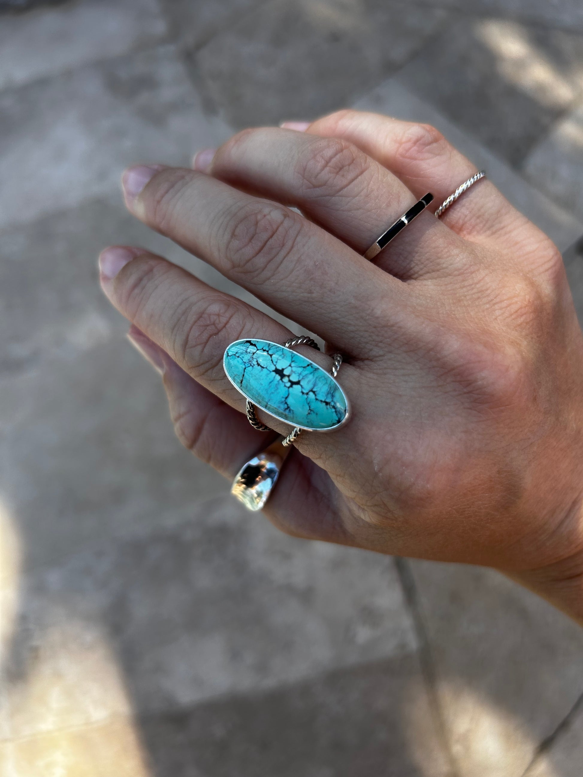 This ring features a surfboard shaped Wild Horse Turquoise stone with 2 14 gauge sterling silver twisted ring bands.
